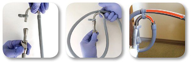 Plug adapter into the HVE. Loop hose as shown using the Ergo Clip attach to the top of the curved metal tube. Point curved metal tube and hose end towards patient’s head. Insert the Nu-Bird suction mirror into the hose end until it clicks in and freely rotates with out falling out.