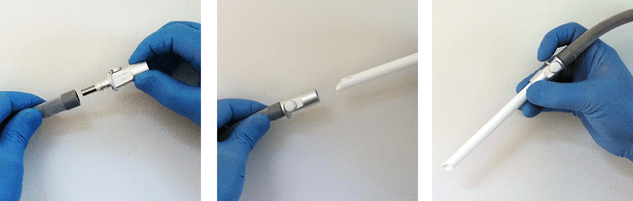 To use Nu-Bird hose with standard HVE tip, simply insert the Nu-Bird swivel HVE connector fitting into the gray hose end fitting until it clicks and rotates freely, then insert HVE tip into connector port. Use the modified pen grasp to hold HVE and rotate between fingers for better angulation.