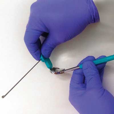 Allows free rotation and is held with modified pen grasp. Better control of aerosols and ergonomics.